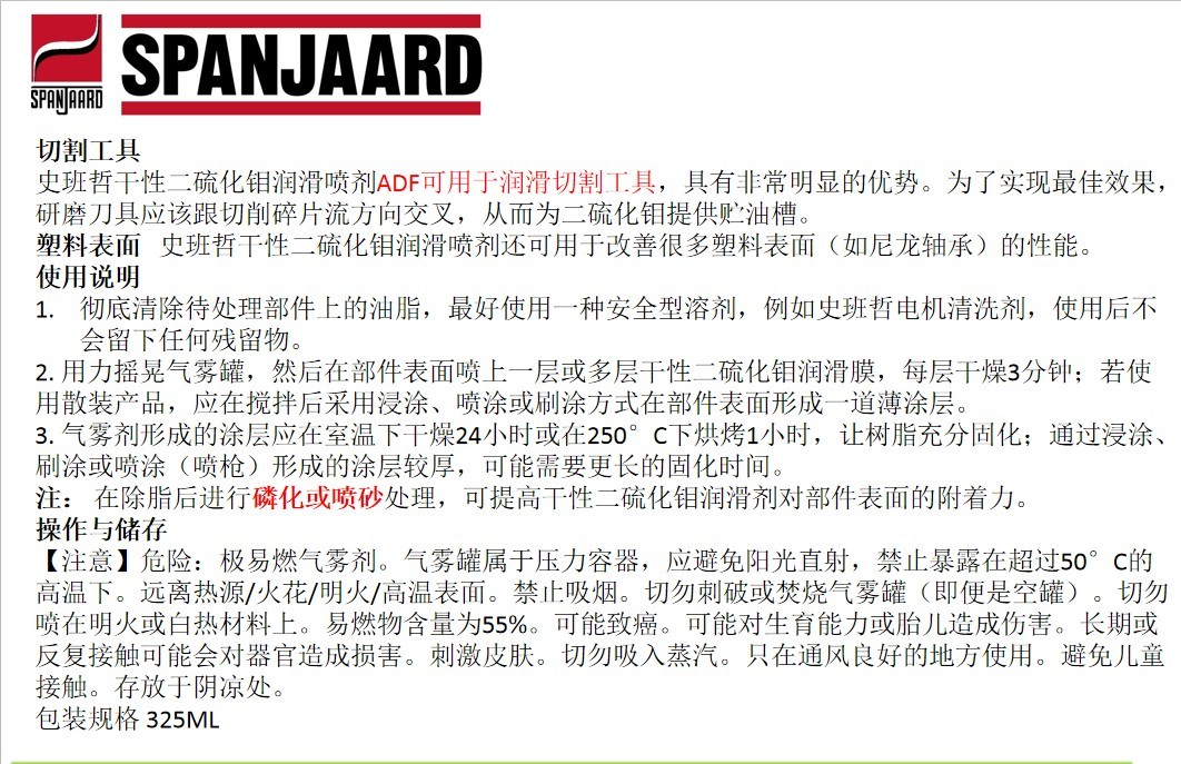Spanjaard ADF(史班哲干性二硫化鉬潤滑噴劑)-20℃~350℃使用