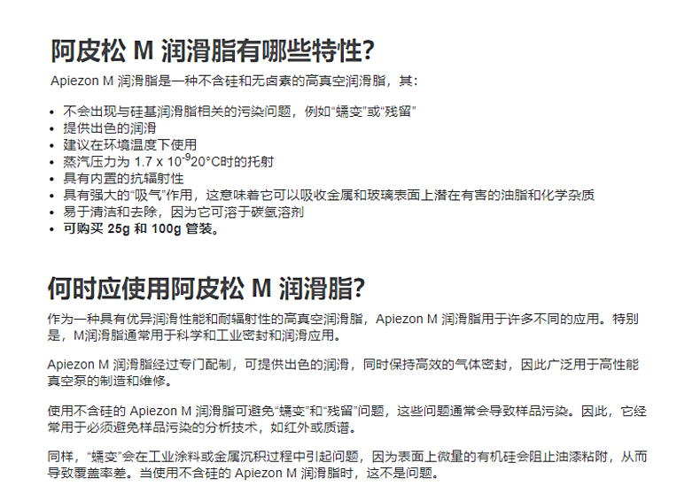 英國(guó)APIEZON阿佩佐M型25g 100g真空潤(rùn)滑脂劑硅脂密封10 至 30°